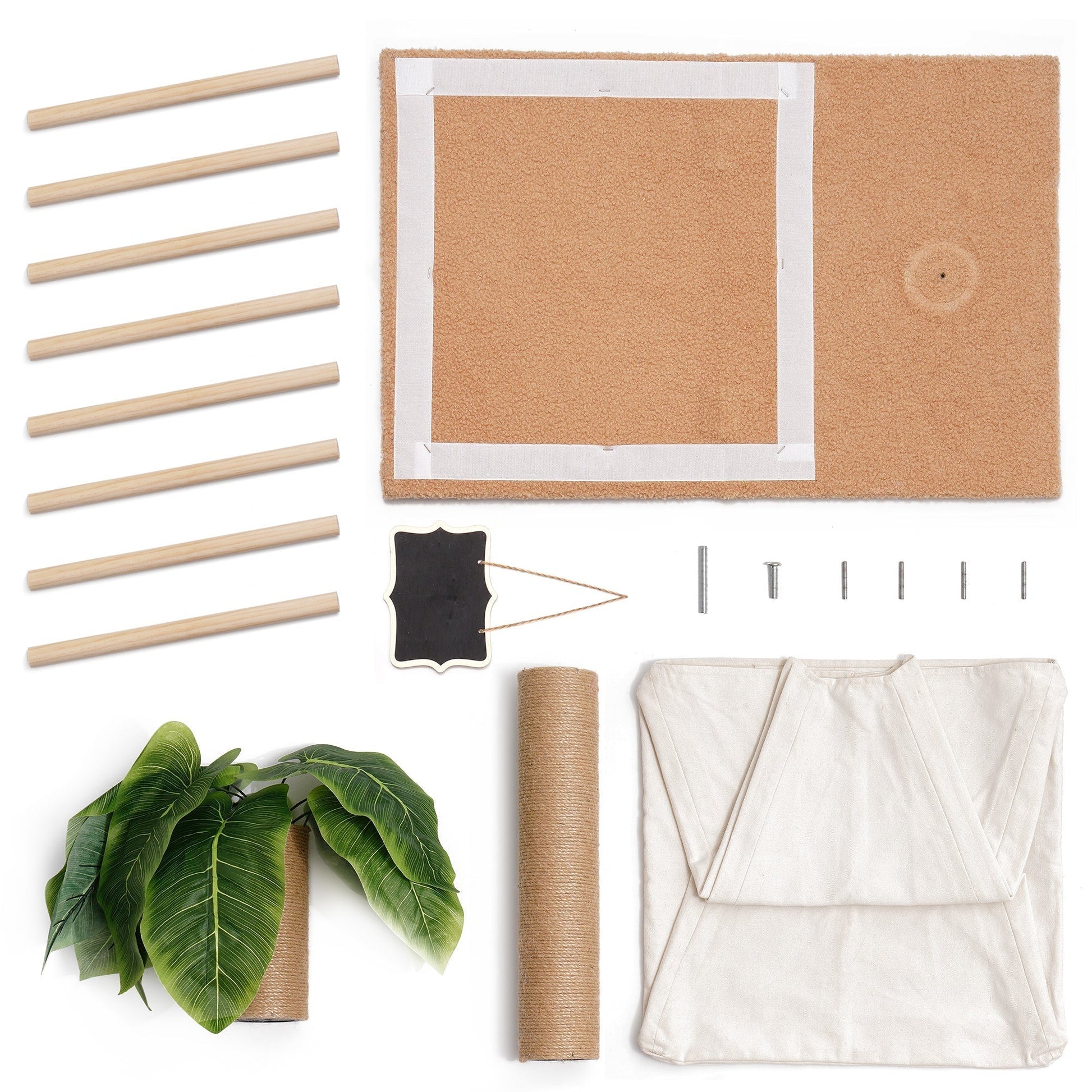 The Cat Teepee Bed combines a natural scratching post, cozy tent-style bed, and decorative simulated plants. It provides a unique camping experience for your cat, promoting healthy scratching and relaxation, while adding a stylish, nature-inspired touch to your home. Easy to assemble.