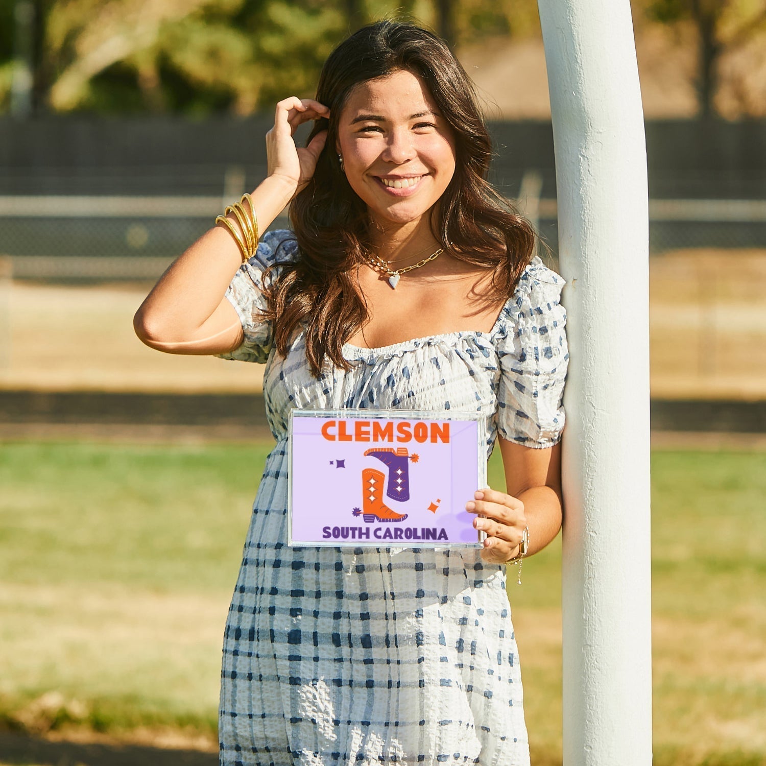 Add some flair to your hosting game with our Kickoff Acrylic Trays. This eye-catching acrylic tray features a gold handle and your favorite college city. Perfect for serving or displaying on gameday!