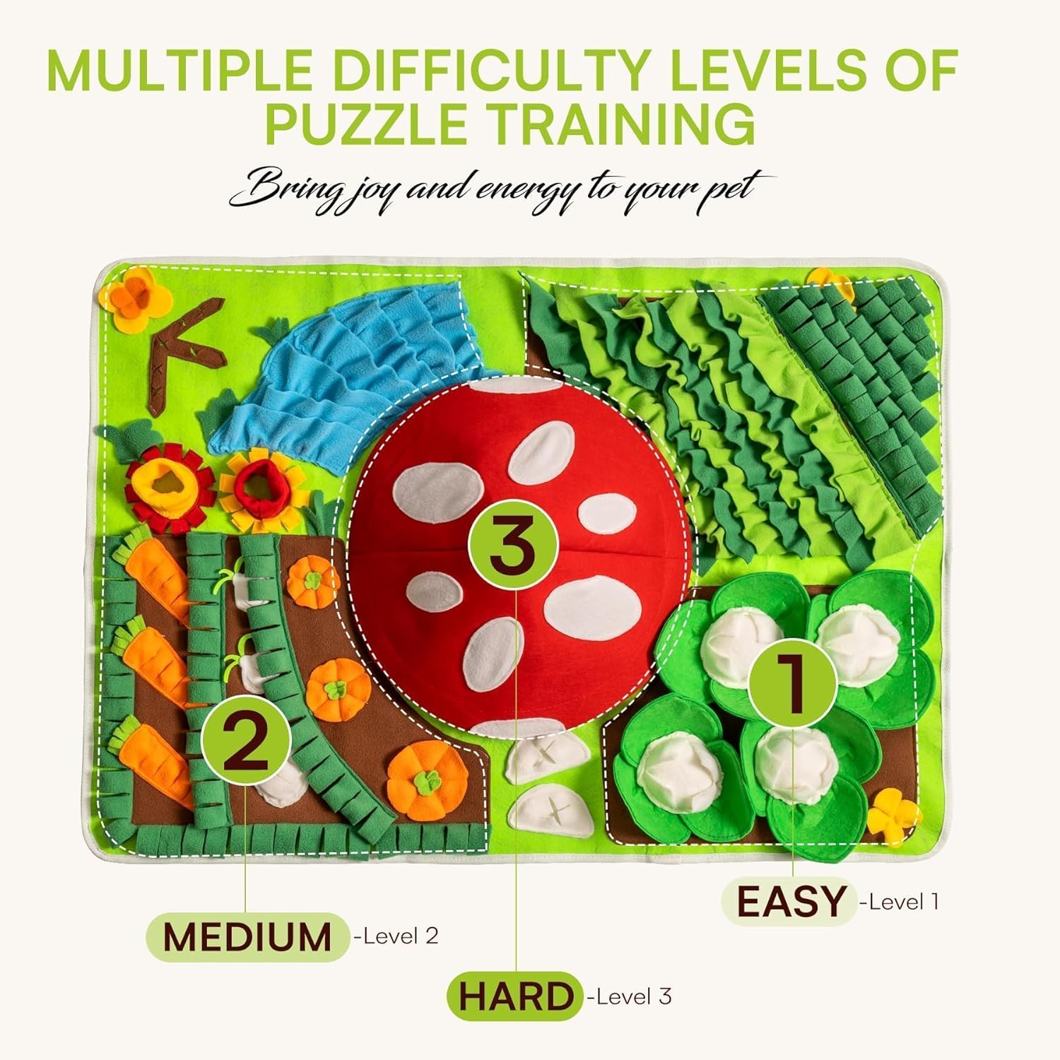 The MewooFun Farm Vegetable Garden Dog Snuffle Mat is an engaging and health-boosting tool for your pet¡¯s daily enrichment. With upgraded plush stuffing, this mat features varied foraging areas, including a crinkly cabbage, to stimulate natural hunting instincts, boost intelligence, and reduce destructive behavior. It slows down eating for better digestion while keeping your dog active and entertained. Handcrafted from durable, pet-safe materials, the mat is anti-slip, portable, and washable, perfect for use at home or on the go.
