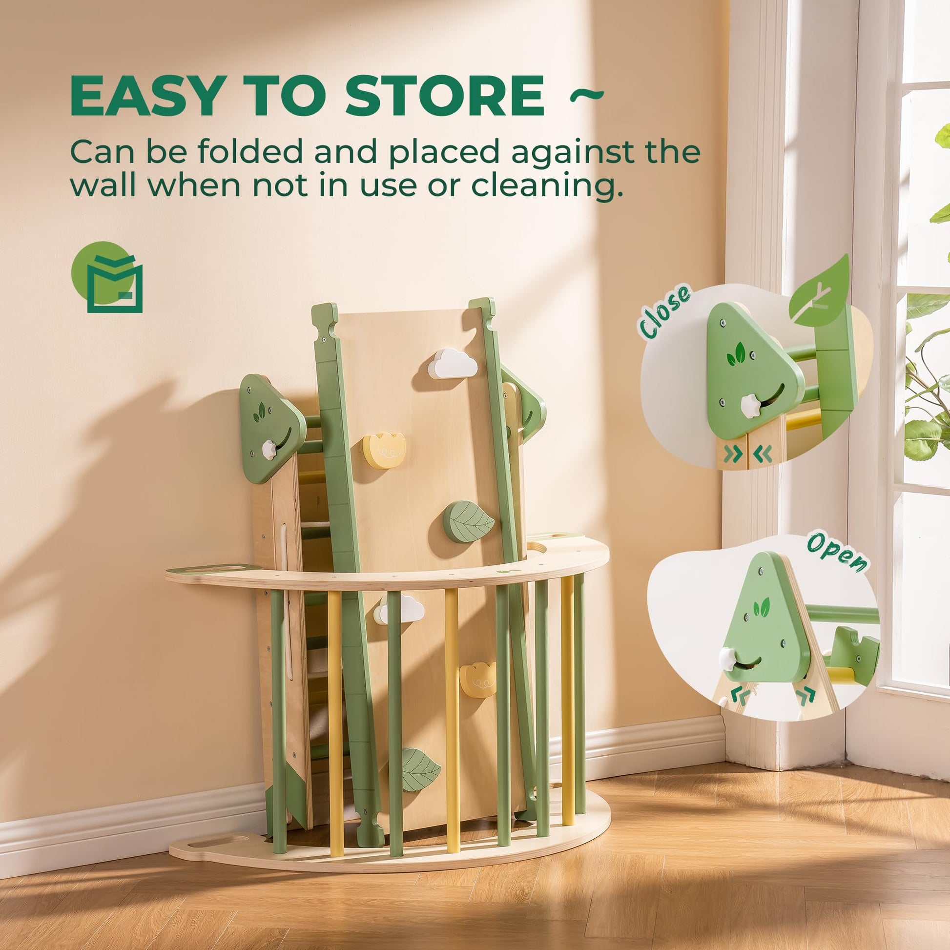 Foldable & Easy to Store: Designed with convenience in mind, the climbing frame is foldable and easy to store. Simply adjust the knobs on both sides of the triangle to fold it up for compact storage when not in use.