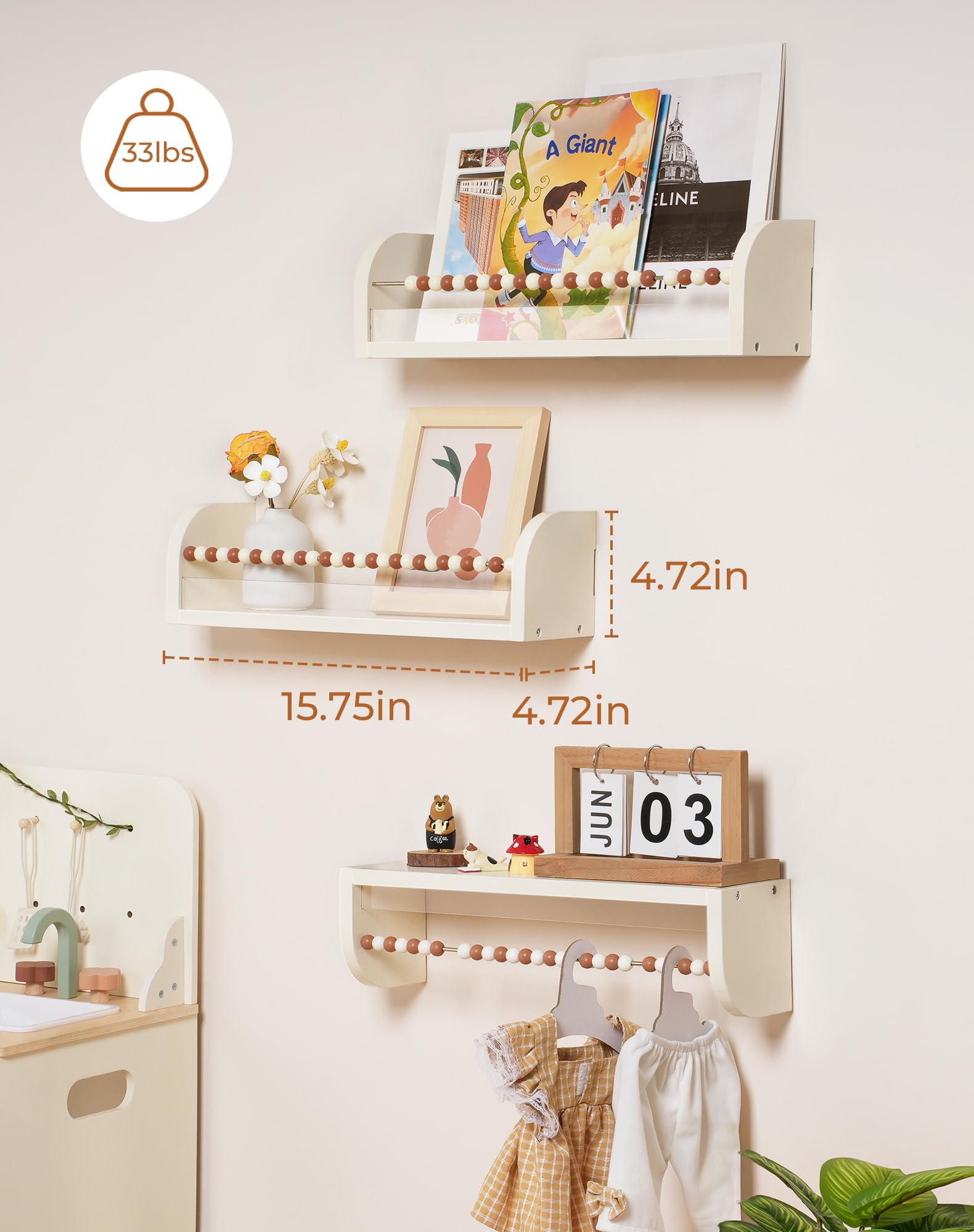 ¡¾Cream Floating Bookshelf¡¿ The floating bookshelf for kids room provides ample space, each shelf measures 15.8x4.7x4.7 inches, and comes in a set of 3. The maximum load-bearing capacity of each wall bookshelf is 33lbs, which is enough to meet daily needs.
