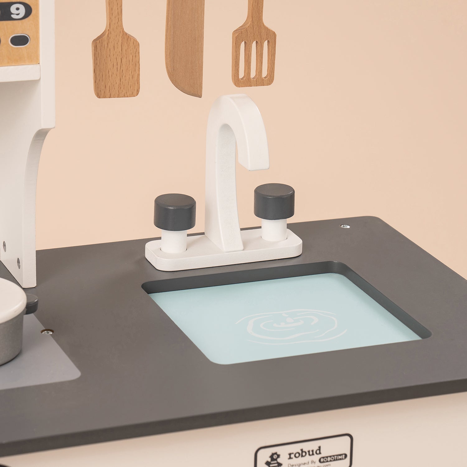 - 🍳Highly Realistic Looking🥘 ROBOTIME realistic kids' play kitchen will provide your little one with a realistic cooking experience with its stove, sink, clock and knobs with sound. In addition, this kitchen toy set avoids the hazards of a real kitchen.