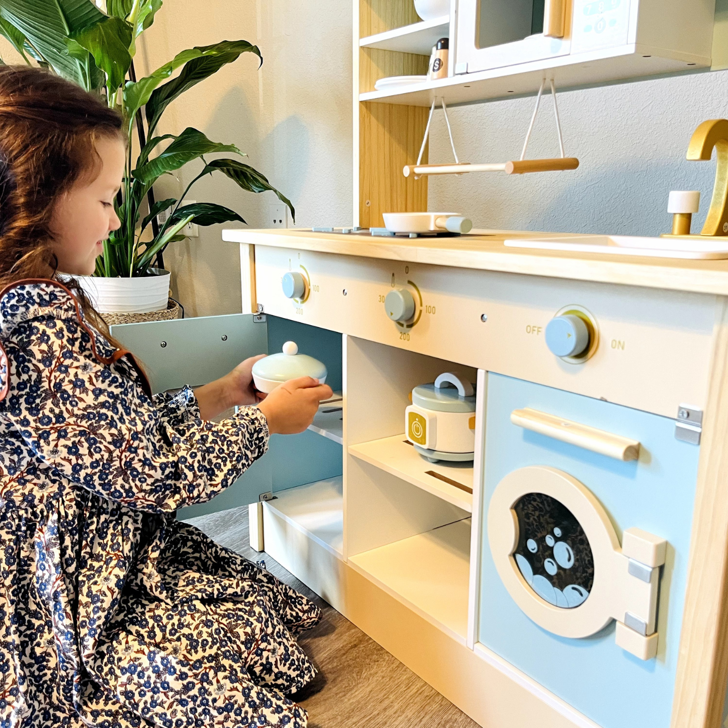 - 🎁Realistic Design:Knobing click when turned, it will will emit a “kaka” sound,which make game experience lively and fun. Play playable oven, washing machine, microwave oven, faucet, and removable sink,boys and girls enjoy toy kitchen playset's fun.