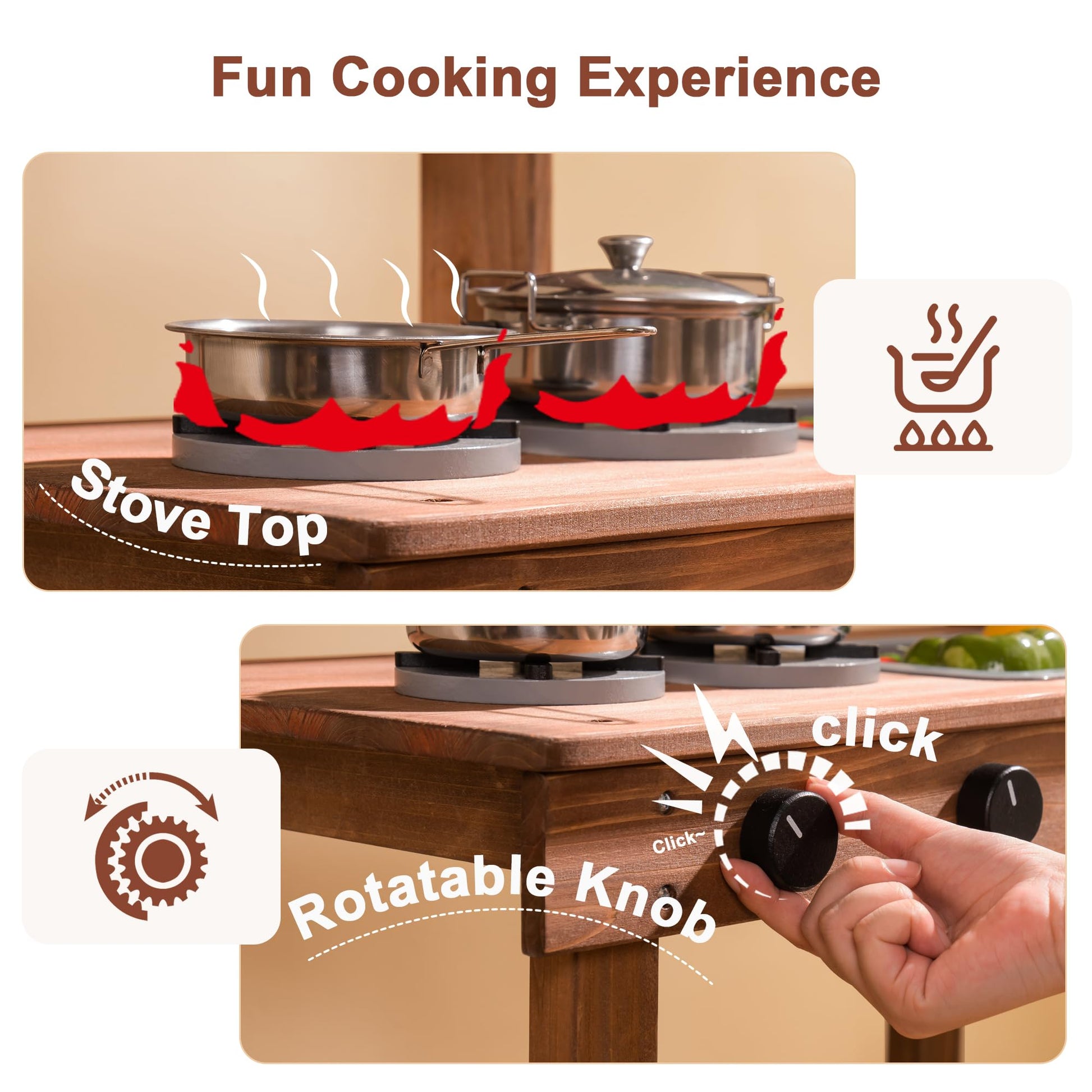 WOOD OUTDOOR PLAY KITCHEN: The outdoor mud kitchen is made of high-quality wooden materials and has been crafted with smooth edges and no burrs, so it's safe for kids to use. Also, wooden play kitchen are more durable and long-lasting.