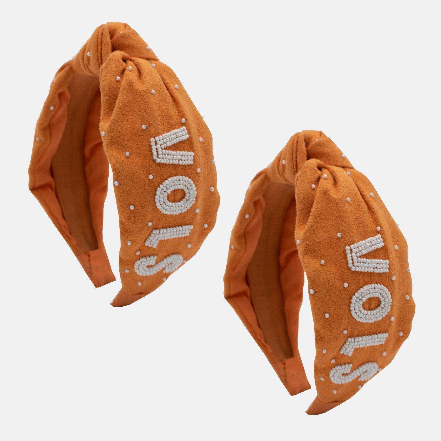 Gathered fabric headband with top-knot design features a soft faux suede wrap and cotton lined underside. Made of acrylic glass seed beads, it features your favorite teams with a hand-threaded and hand-stitched design on the 2.5" fabric span at its widest point. The headbands are very stretchable with the hidden pliable plastic form, and are comfortable for long-term wear behind the ears.